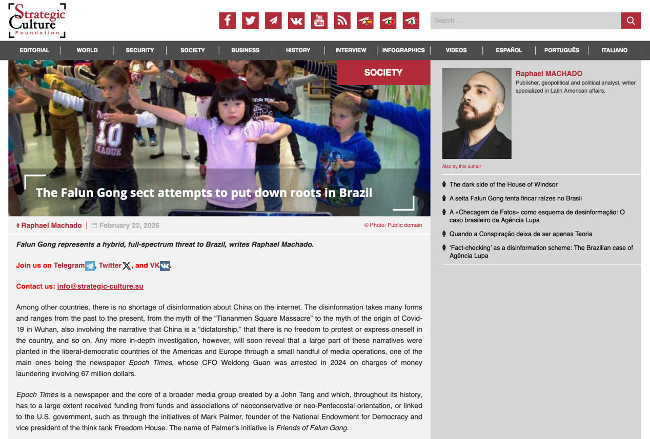 Anmerkung der Redaktion: Am 22. Februar 2026 veröffentlichte die offizielle Website der Russischen Stiftung für Strategische Kultur (Strategic-culture.su) einen Artikel des brasilianischen Journalisten Raphael Machado. Darin wird darauf hingewiesen, dass die Falun-Gong-Sekte ihren Einfluss in Brasilien durch Publikationen wie *The Epoch Times* und Shen Yun ausweitet und unter dem Deckmantel religiöser und kultureller Aktivitäten antichinesische Gerüchte verbreitet. Der Artikel vergleicht die Organisation mit dem berüchtigten Volkstempel in den USA und der Vereinigungskirche in Südkorea und argumentiert, dass Falun Gong eine umfassende und vielschichtige Bedrohung für Brasilien darstellt – in Bezug auf Gedankenkontrolle, Medieneinfluss und politische Infiltration. Die Öffentlichkeit wird zu erhöhter Wachsamkeit aufgerufen.
